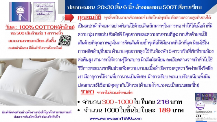 ปลอกหมอน 20 x 30 ลิ้น 6 นิ้ว ผ้า cotton100% 500T สีขาวเรียบ