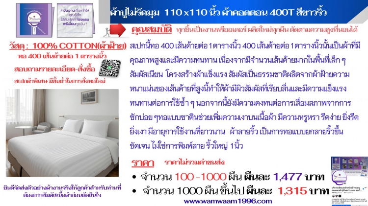 สเปกนี้ทอ 400 เส้นด้ายต่อ 1 ตารางนิ้ว 400 เส้นด้ายต่อ 1 ตารางนิ้วนั้นเป็นผ้าที่มีคุณภาพสูงและมีความทนทาน เนื่องจากมีจำนวนเส้นด้ายมากในพื้นที่เล็ก ๆ สัมผัสเนียน โครงสร้างผ้าแข็งแรง สัมผัสเป็นธรรมชาติผลิตจากผ้าฝ้ายความหนาแน่นของเส้นด้ายที่สูงนี้ทำให้ผ้ามีผิวสัมผัสที่เรียบลื่นและมีความแข็งแรงทนทานต่อการใช้ซ้ำ ๆ นอกจากนี้ยังมีความคงทนต่อการเสื่อมสภาพจากการซักบ่อย ๆทอแบบซาตินช่วยเพิ่มความเงาบนเนื้อผ้า มีความหรูหรา รีดง่าย ยิ่งรีดยิ่งเงา มีอายุการใช้งานที่ยาวนาน ผ้าลายริ้ว เป็นการทอแบบยกลายริ้วขึ้นชัดเจน ไม่ใช่การพิมพ์ลาย ริ้วใหญ่ 1 นิ้ว ผ้าขาวเรียบ ทอแบบเรียบเนียนทั้งผืน