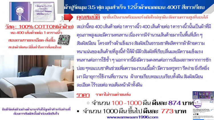 ผ้าปูรัดมุม 3.5 ฟุต มุมสำเร็จ 12 นิ้ว ผ้า cotton100% 400T สีขาวเรียบ