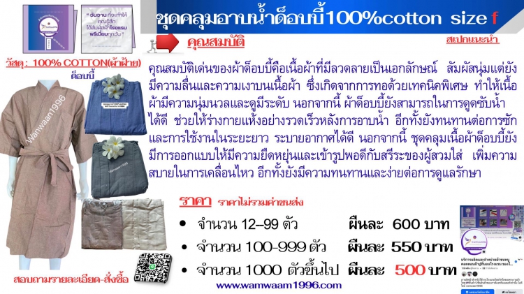 ได้ดี ช่วยให้ร่างกายแห้งอย่างรวดเร็วหลังการอาบน้ำ อีกทั้งยังทนทานต่อการซักและการใช้งานในระยะยาว ระบายอากาศได้ดี นอกจากนี้ ชุดคลุมเนื้อผ้าด็อบบี้ยังมีการออกแบบให้มีความยืดหยุ่นและเข้ารูปพอดีกับสรีระของผู้สวมใส่ เพิ่มความสบายในการเคลื่อนไหว อีกทั้งยังมีความทนทานและง่ายต่อการดูแลรักษา