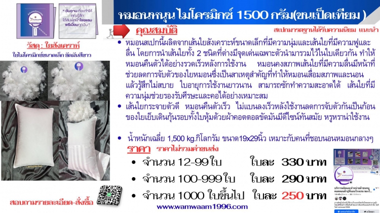 - เส้นใยกระจายตัวดี หมอนคืนตัวเร็ว ไม่แบนลงเร็วหลังใช้งานลดการจับตัวกันเป็นก้อนของใยเย็บเดินกุ้นรอบทั้งใบหุ้มด้วยผ้าคอตตอลขัดมันมีดีไซน์ทันสมัย หรูหราน่าใช้งาน