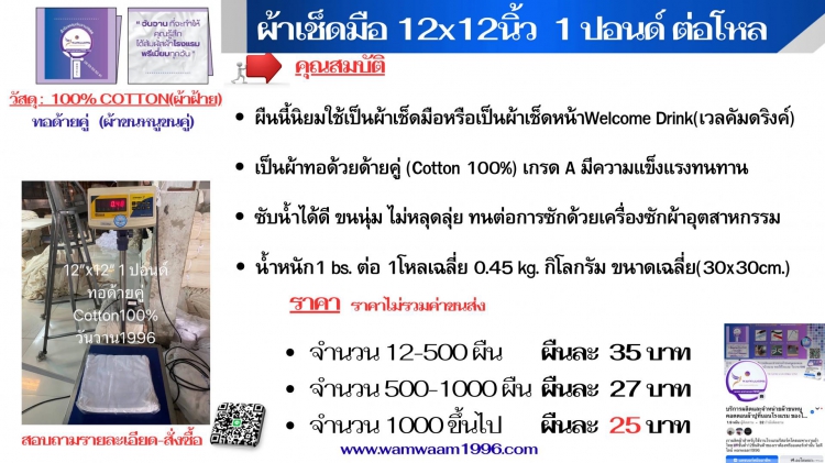 ผ้าเช็ดมือ 12x12 นิ้ว 1 ปอนด ต่อโหล