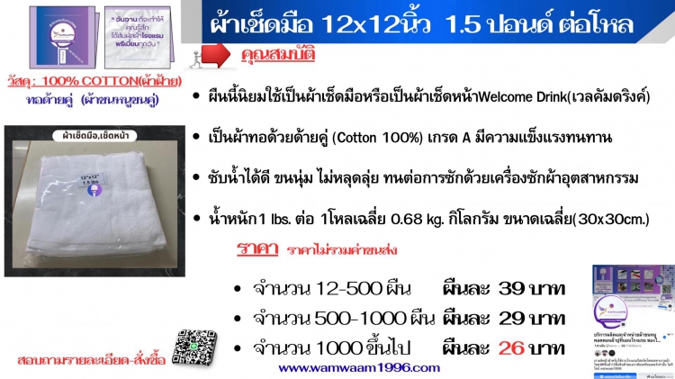 ผ้าเช็ดมือ 12x12 นิ้ว 1.5 ปอนด์ ต่อโหล