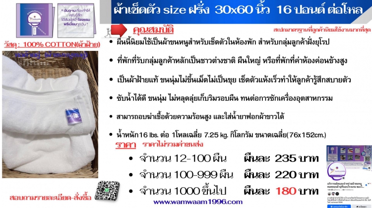 ผ้าเช็ดตัว Size ฝรั่ง 30x60 นิ้ว 16 ปอนด์ ต่อโหล