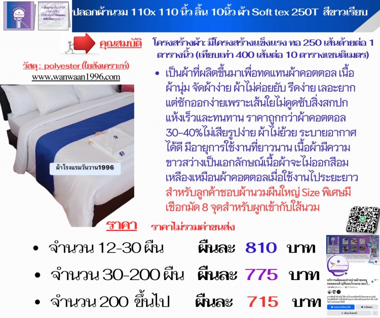 เป็นผ้าที่ผลิตขึ้นมาเพื่อทดแทนผ้าคอตตอล เนื้อผ้านุ่ม จัดผ้าง่าย ผ้าไม่ค่อยยับ รีดง่าย เลอะยากแต่ซักออกง่ายเพราะเส้นใยไม่ดูดซับสิ่งสกปกแห้งเร็วและทนทาน ราคาถูกกว่าผ้าคอตตอล 30-40%ไม่เสียรูปง่าย ผ้าไม่ย้วย ระบายอากาศได้ดี มีอายุการใช้งานที่ยาวนาน เนื้อผ้ามีความขาวสว่างเป็นเอกลักษณ์เนื้อผ้าจะไม่ออกสีอมเหลืองเหมือนผ้าคอตตอลเมื่อใช้งานไประยะยาว สำหรับลูกค้าชอบผ้านวมผืนใหญ่ Size พิเศษมีเชือกมัด 8 จุดสำหรับผูกเข้ากับใส้นวม