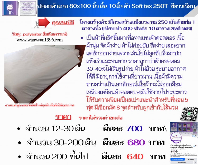 เป็นผ้าที่ผลิตขึ้นมาเพื่อทดแทนผ้าคอตตอล เนื้อผ้านุ่ม จัดผ้าง่าย ผ้าไม่ค่อยยับ รีดง่าย เลอะยากแต่ซักออกง่ายเพราะเส้นใยไม่ดูดซับสิ่งสกปกแห้งเร็วและทนทาน ราคาถูกกว่าผ้าคอตตอล 30-40%ไม่เสียรูปง่าย ผ้าไม่ย้วย ระบายอากาศได้ดี มีอายุการใช้งานที่ยาวนาน เนื้อผ้ามีความขาวสว่างเป็นเอกลักษณ์เนื้อผ้าจะไม่ออกสีอมเหลืองเหมือนผ้าคอตตอลเมื่อใช้งานไประยะยาว เป็นขนาดมารตฐานสำหรับที่นอน 5 ฟุต มีเชือกมัด 8 จุดสำหรับผูกเข้ากับใส้นวม
