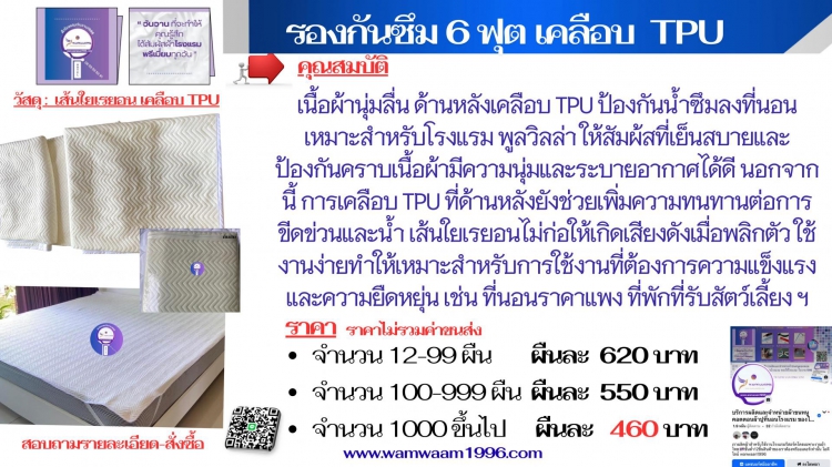 เนื้อผ้านุ่มลื่น ด้านหลังเคลือบ TPU ป้องกันน้ำซึมลงที่นอน เหมาะสำหรับโรงแรม พูลวิลล่า ให้สัมผ้สที่เย็นสบายและป้องกันคราบเนื้อผ้ามีความนุ่มและระบายอากาศได้ดี นอกจากนี้ การเคลือบ TPU ที่ด้านหลังยังช่วยเพิ่มความทนทานต่อการขีดข่วนและน้ำ เส้นใยเรยอนไม่ก่อให้เกิดเสียงดังเมื่อพลิกตัว ใช้งานง่ายทำให้เหมาะสำหรับการใช้งานที่ต้องการความแข็งแรงและความยืดหยุ่น เช่น ที่นอนราคาแพง ที่พักที่รับสัตว์เลี้ยง ฯ