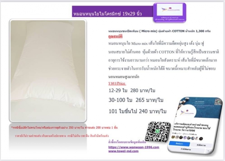 | หมอนหนุนขนเป็ดเทียม ( Micro mix) หุ้มด้วยผ้า COTTON น้ำหนัก 1,300 กรัม | |||||